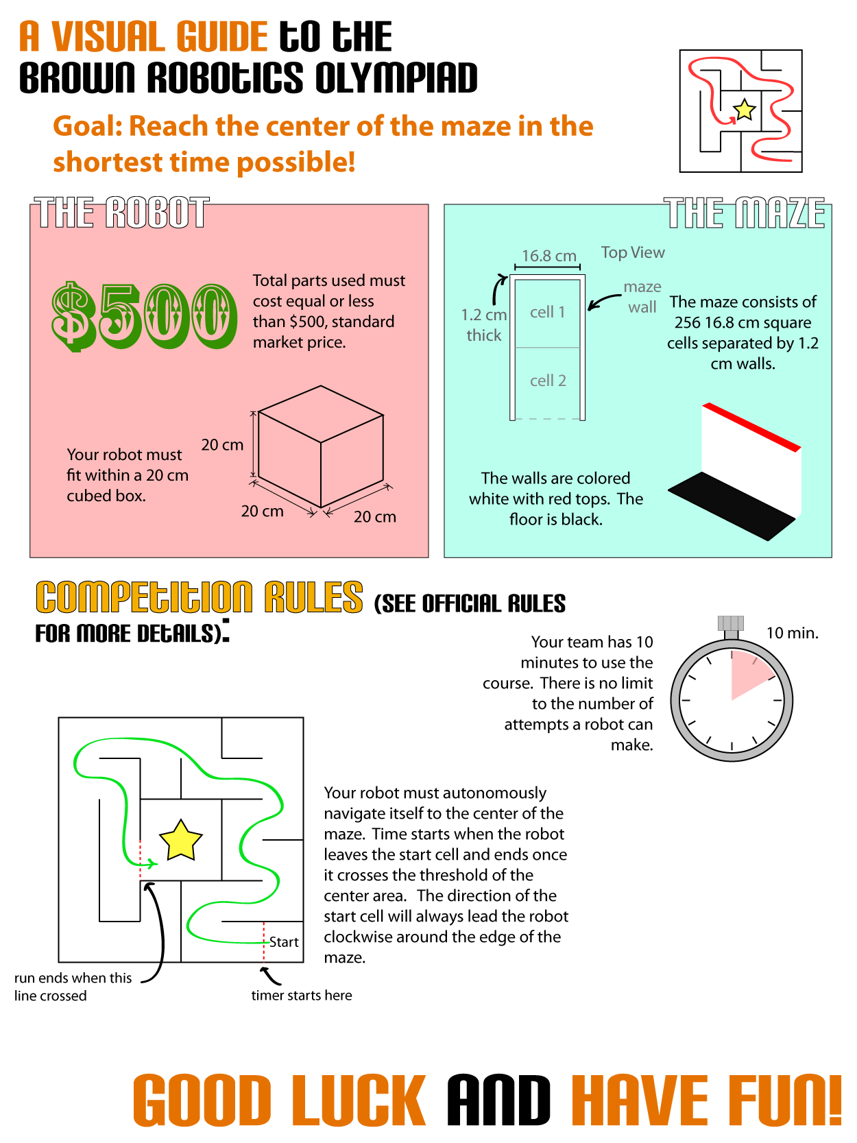 The premise of the contest was to construct a small robot that would autonomously navigate its way through a 16 x 16 cell maze as quickly as possible, all on a $500 budget. Detailed competition rules can be found here: Brown IEEE Robotics Olympiad. This provided great experience in fabrication, control, and heuristics.
